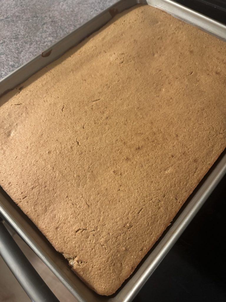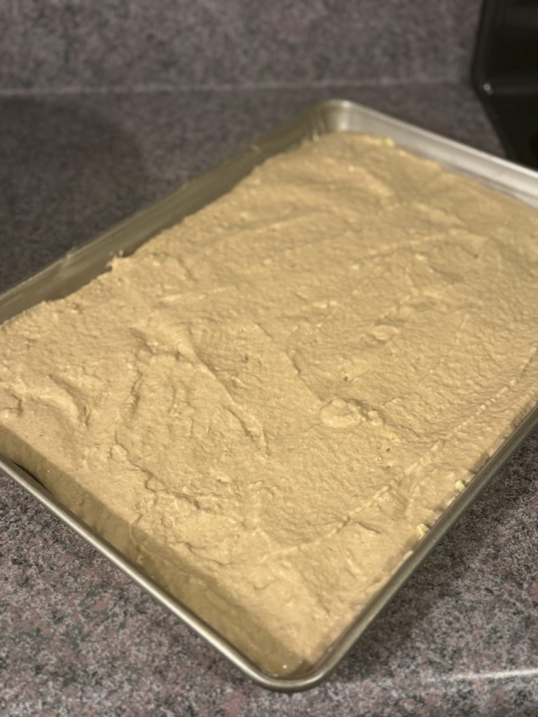 The batter will seem like it won’t cover the whole pan, but keep spreading, it will. It will rise in the oven.