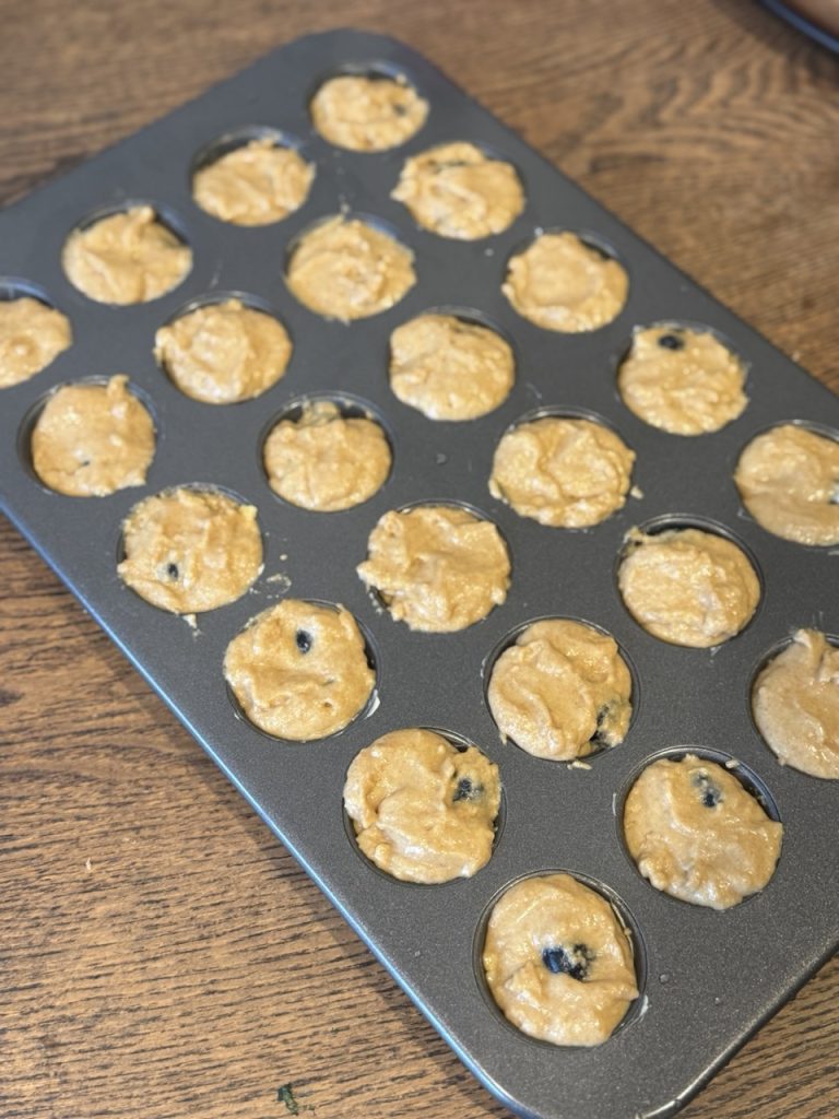 • Fold your blueberries into the remaining batter and fill up the rest of each muffin tin.