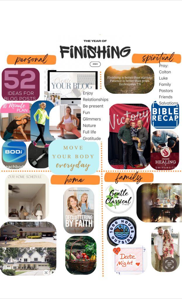3. Make a Canva vision board—I’ve done this for the past few years and I can’t tell you what a difference it’s made. I make it on Canva and I put it as my screen saver. It doesn’t have my exact goals listed, but it has photos and words that represent my goals. This is my vision board from 2024–it was a year that I was pregnant, so that was my big focus of the year. I didn’t accomplish everything that was listed, but it helped me accomplish so much more than I ever would have. I believe seeing photos of your goals daily is powerful.